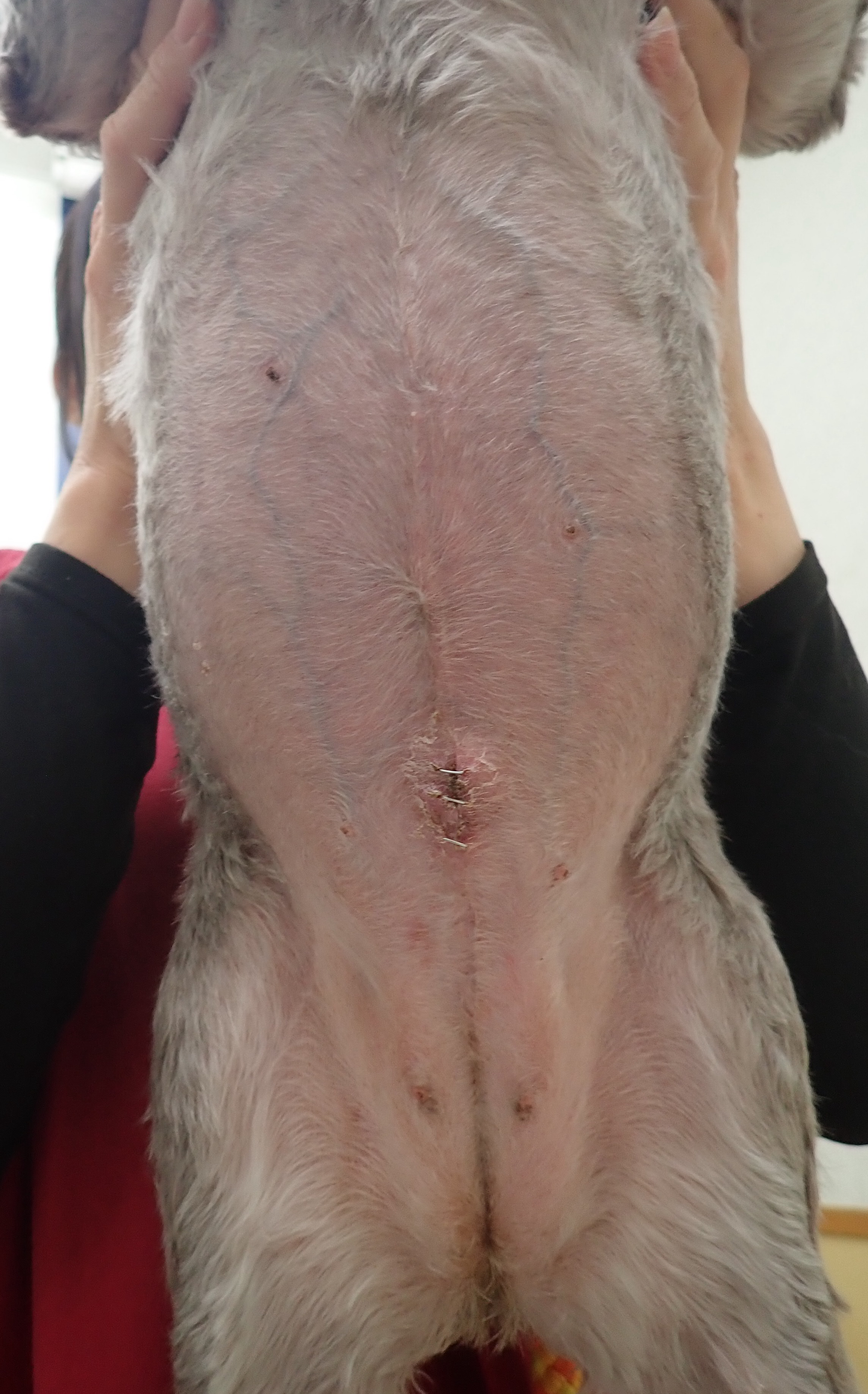 Ginoちゃん(ミニチュアシュナウザー/5歳/11.5kg)1月に行いました。一つの拡張ポートを使い、腹腔鏡補助下膀胱結石除去を行っています。カメラを使っているため小さい結石まで確実に取りのぞくことができました。