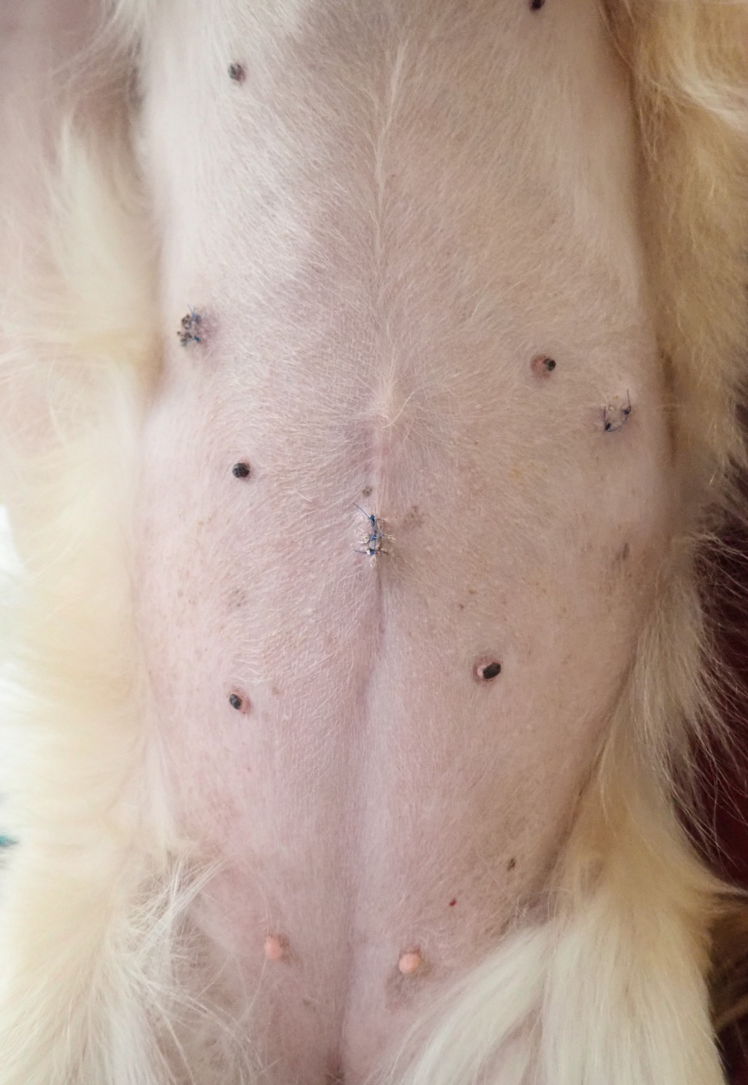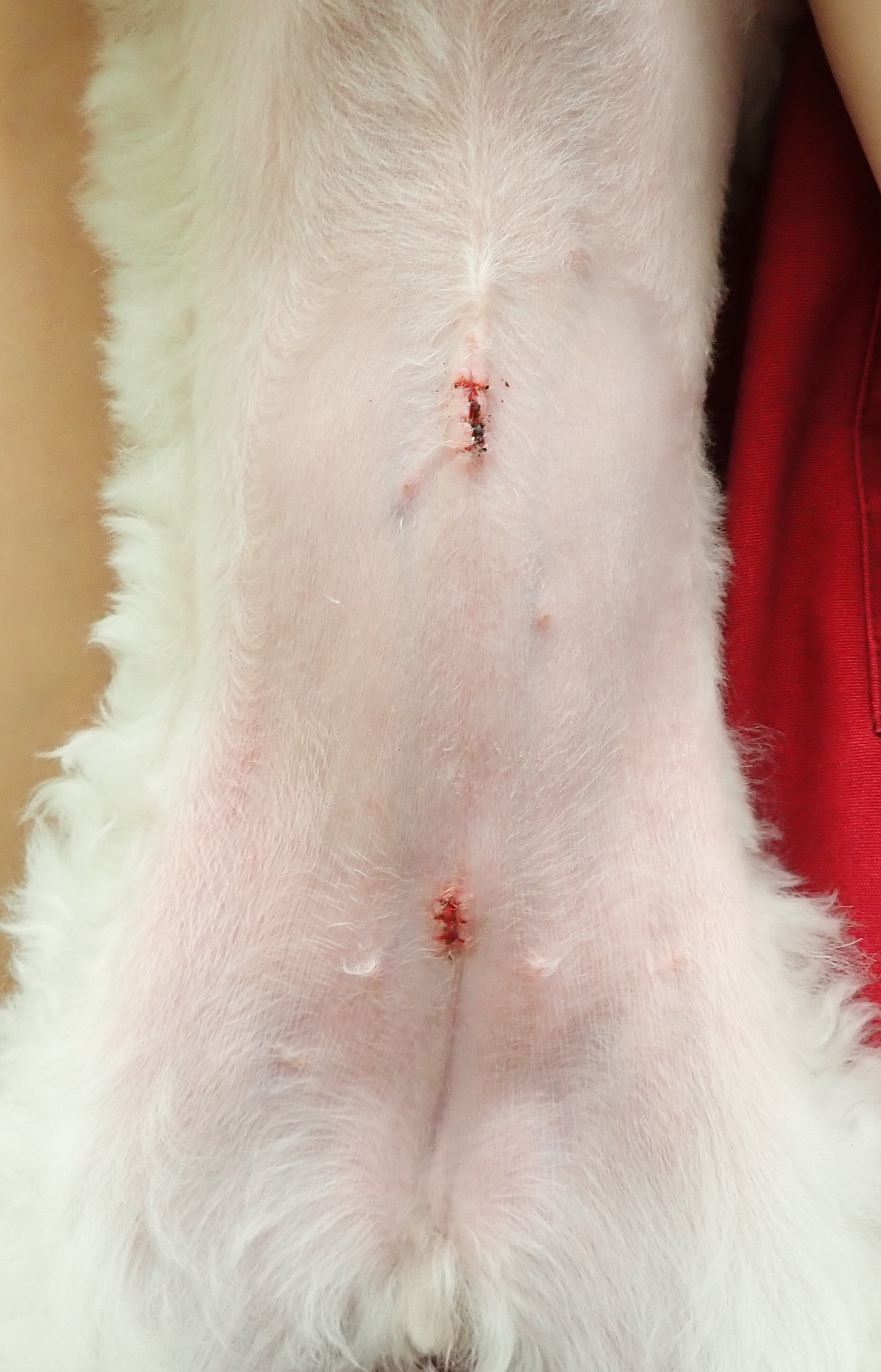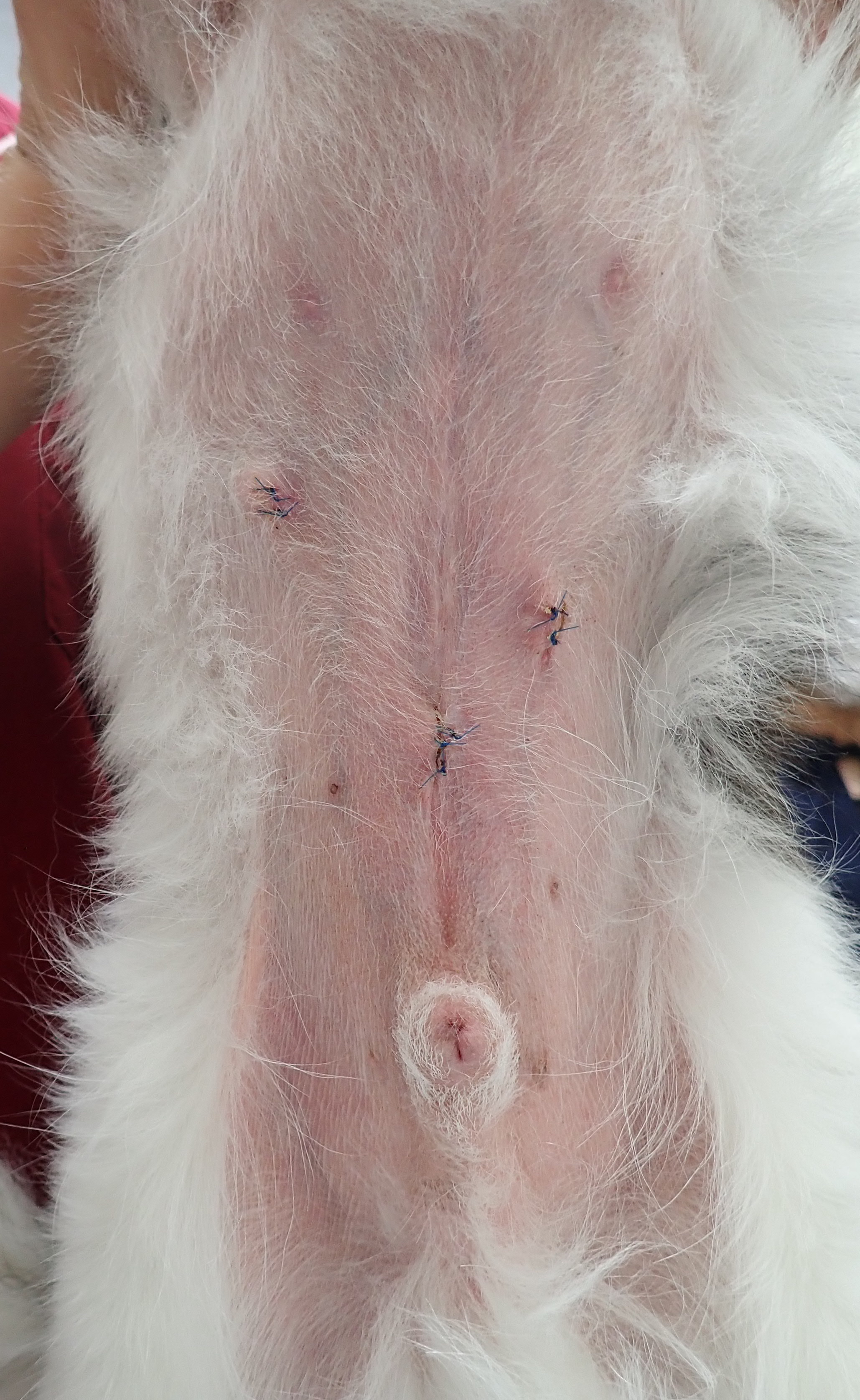空ちゃん(グレートピレニーズ/9ヶ月齢/34kg)1月に行いました。5mm,5mm,5mmのポートを使用し、小さな傷で避妊手術をおこないました。