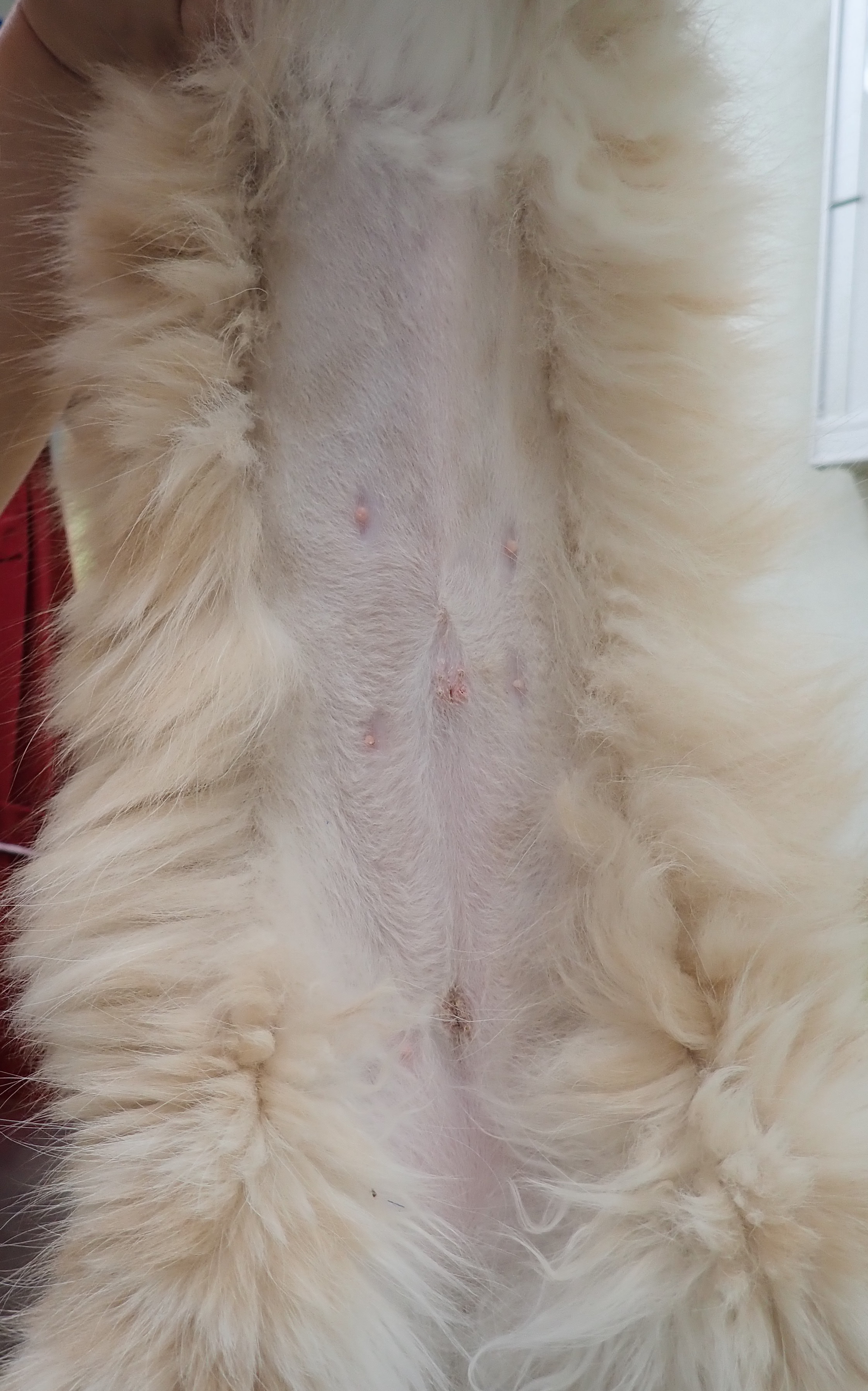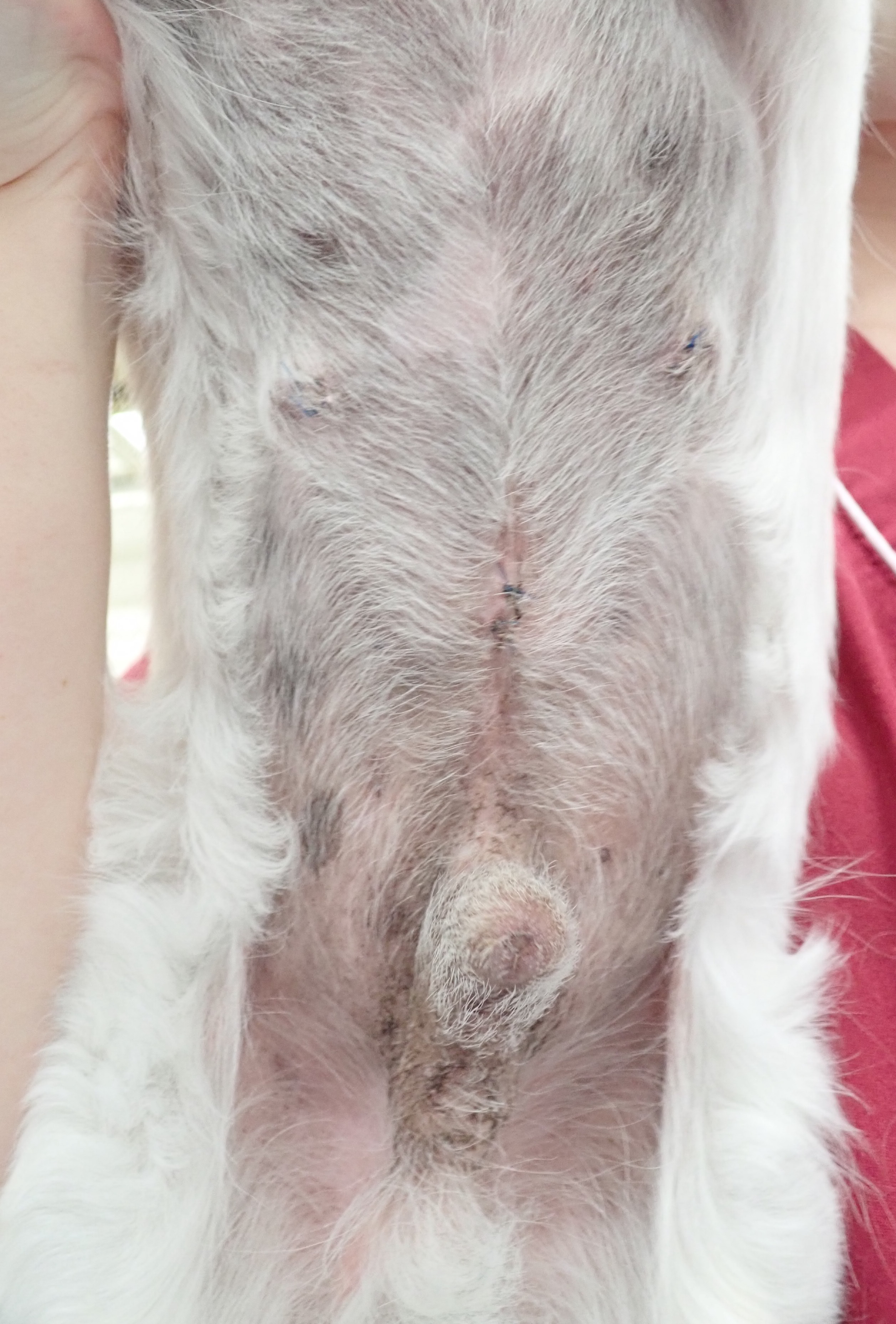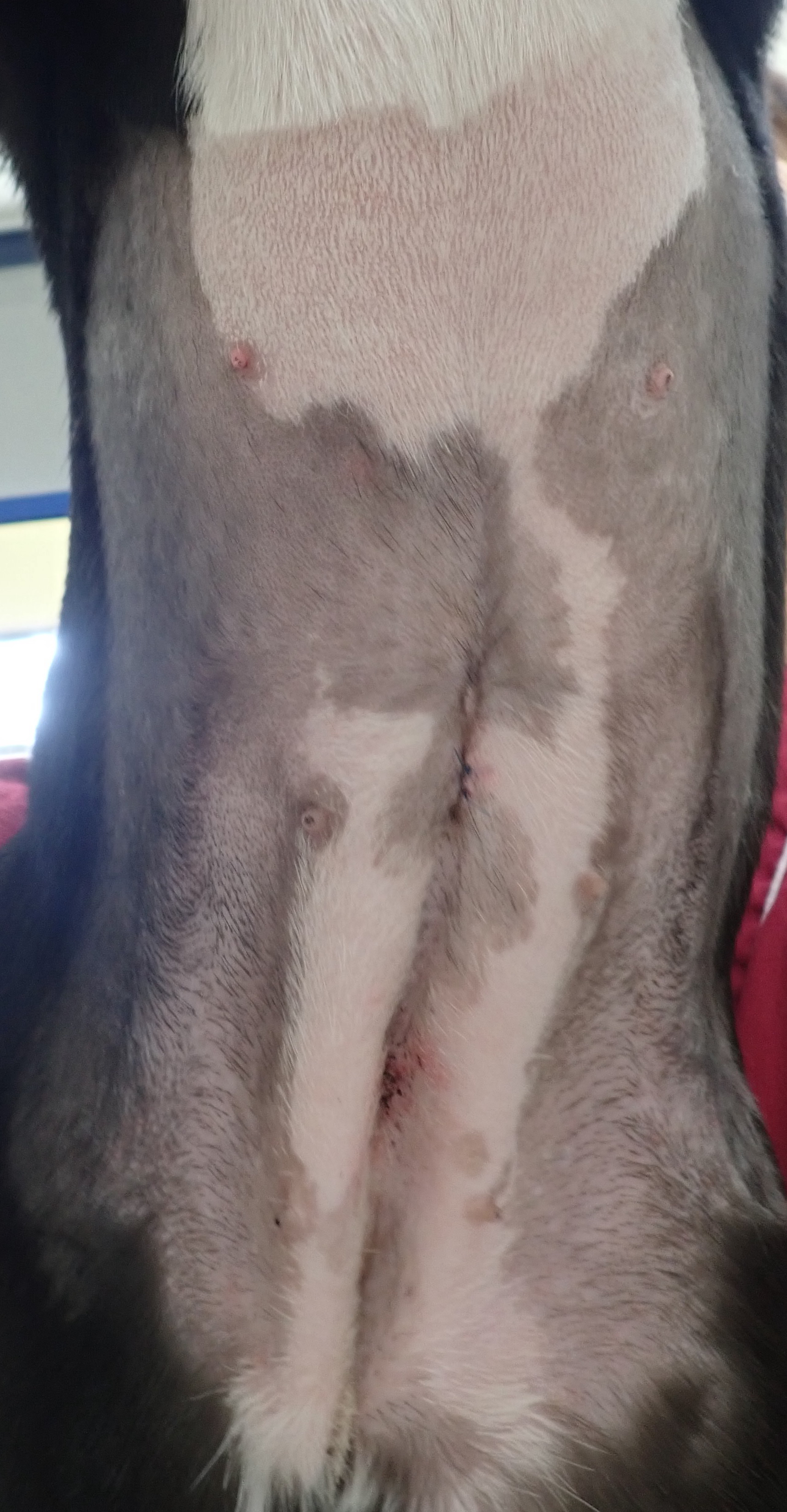 空ちゃん(グレートピレニーズ/9ヶ月齢/34kg)1月に行いました。5mm,5mm,5mmのポートを使用し、小さな傷で避妊手術をおこないました。