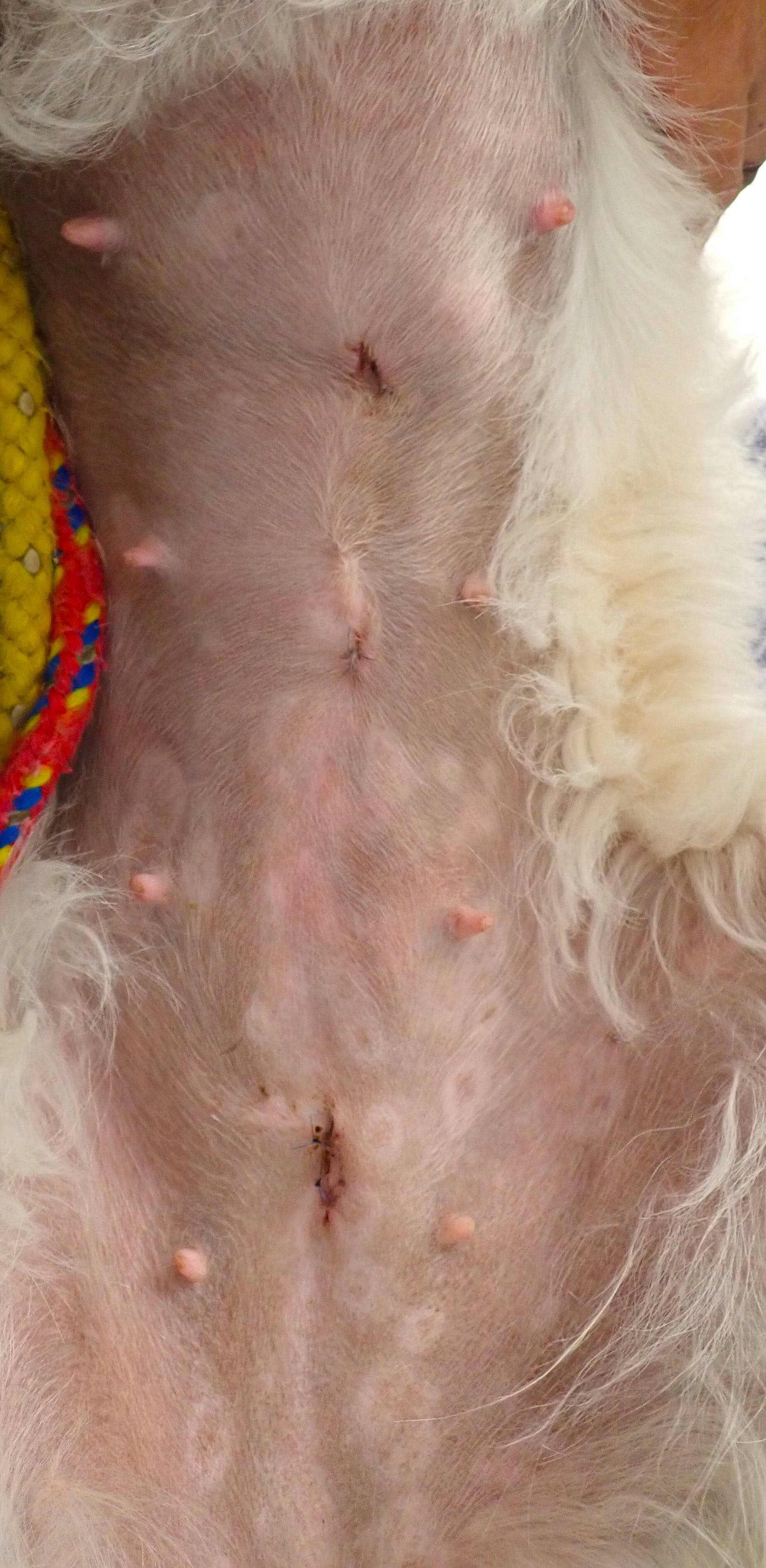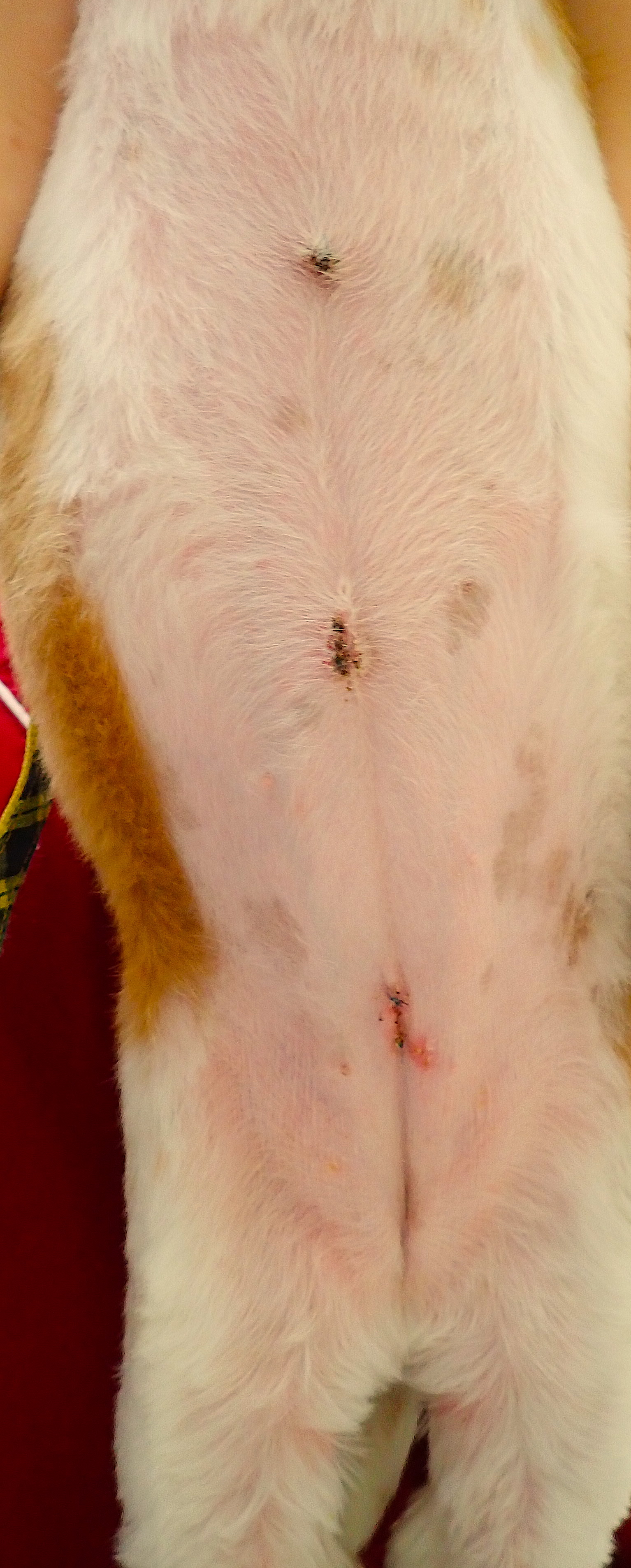 ショコラちゃん(MIX/1歳/20.8kg)3月におこないました。5mm,5mm,5mmの小さい傷で避妊手術しました。