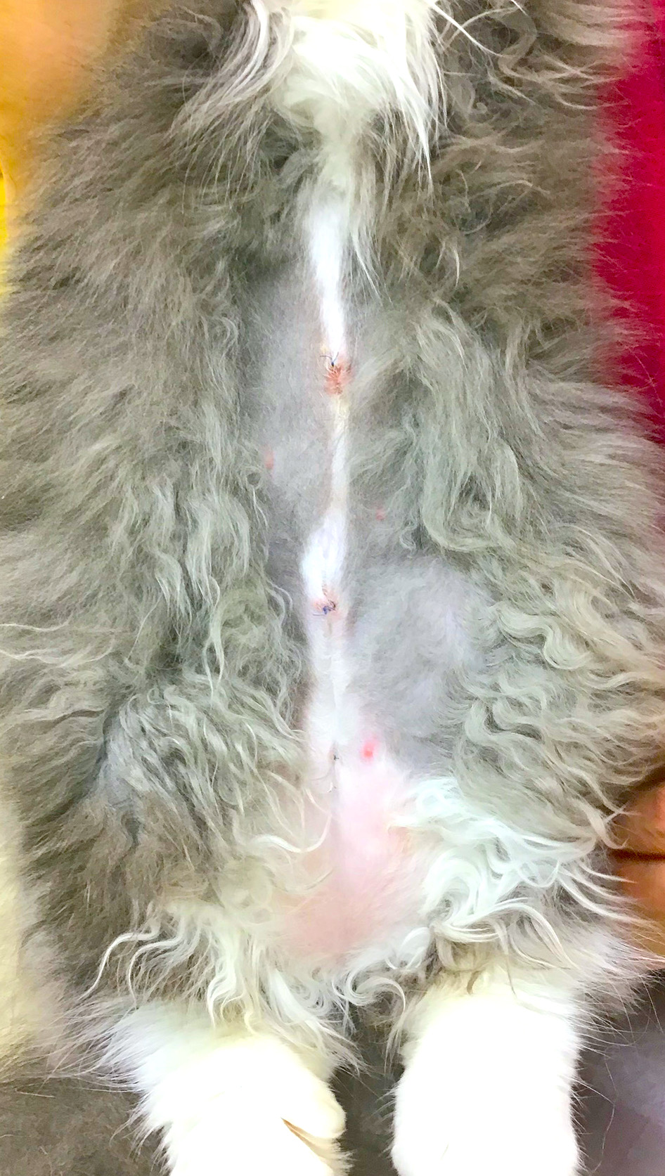 ジーナちゃん(ブリティッシュショーヘアー/8ヶ月齢)6月に行いました。3mm,3mm,5mmのポートを使用し、小さな傷で避妊手術をおこないました。